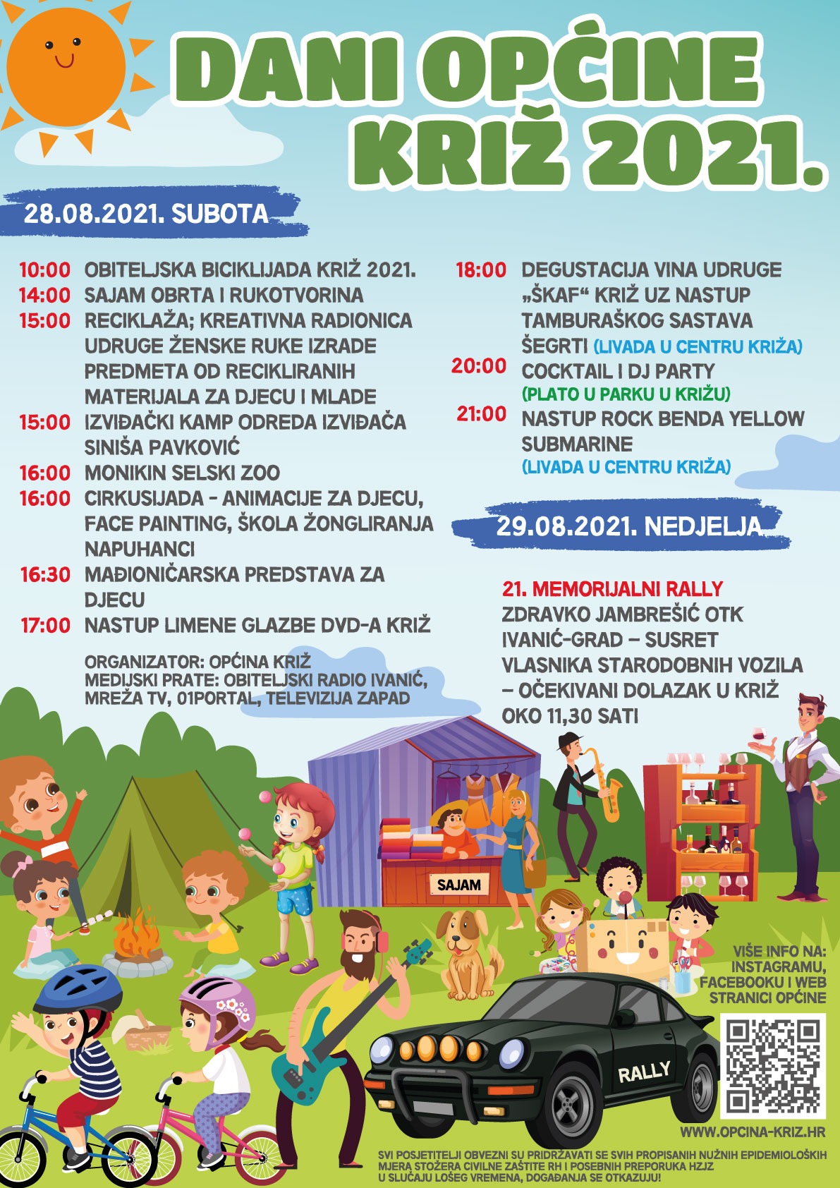 Cjelokupni program održat će se u subotu 28. kolovoza 2021. godine od jutarnjih sati, a započinje obiteljskom biciklijadom. Ostala događanja koja se nastavljaju Sajmom obrta i rukotvorina održavat će se u parku u centru Križa što posjetiteljima omogućava pridržavanje svih mjera i propisane socijalne distance. Glazbeni program biti će organiziran na dvije lokacije i to na livadi u centru Križa od 18 sati gdje Vas očekuje nastup Tamburaškog sastava Šegrti uz degustaciju vina Udruge vinogradara i vinara„Škaf“ Križ. Na prodajnom platou u parku u Križu od 20 sati biti će Cocktail i DJ party te jedno posebno iznenađenje, a od 21 do 24 sata na livadi u centru Križa nastupiti će rock bend Yellow Submarine.