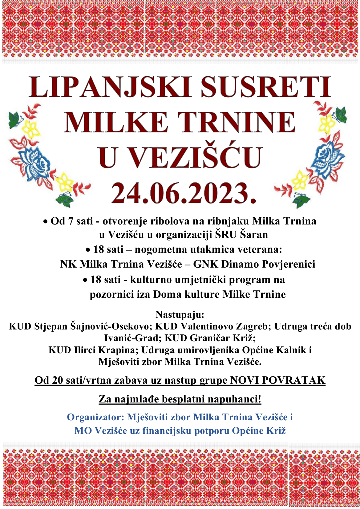 KUD Stjepan Šajnović Osekovo; KUD Valentinovo Zagreb; Udruga treća dob Ivanić-Grad; KUD Graničar Križ; KUD Ilirci Krapina; Udruga umirovljenika Općine Kalnik i Mješoviti zbor Milka Trnina Vezišće. Od 20 sati slijedi vrtna zabava uz nastup grupe NOVI POVRATAK.