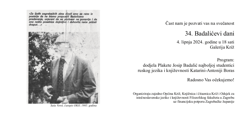 U utorak 4. lipnja 2024. godine u 18 sati u Galeriji Križ održava se program 34. Badalićevih dana, odnosno dodjele Plakete Josip Badalić, ove godine Katarini-Antoniji Boras, najboljoj studentici ruskog jezika i književnosti Filozofskog fakulteta u Zagrebu.