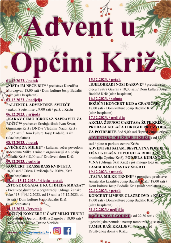 Bliži nam se najljepše vrijeme godine, vrijeme adventa, zajedništva i druženja u kojem sve miriše na bor, kuhano vino i cimet. Općina Križ u suradnji s vrijednim općinskim udrugama i ove je godine pripremila bogat adventski program. Obzirom da su sva događanja besplatna svakako Vas pozivamo da posjetite događanja u sklopu kojih smo pripremili i brojna iznenađenja koja Vam ne želimo još otkriti. Već idućeg vikenda krećemo s hit predstavom Kazališta Moruzgva i Ecijom Ojdanić, a u nedjelju palimo prvu adventsku svijeću gdje vas očekujemo da osjetimo i u zajedništvu gradimo duh ovogodišnjeg Božića.