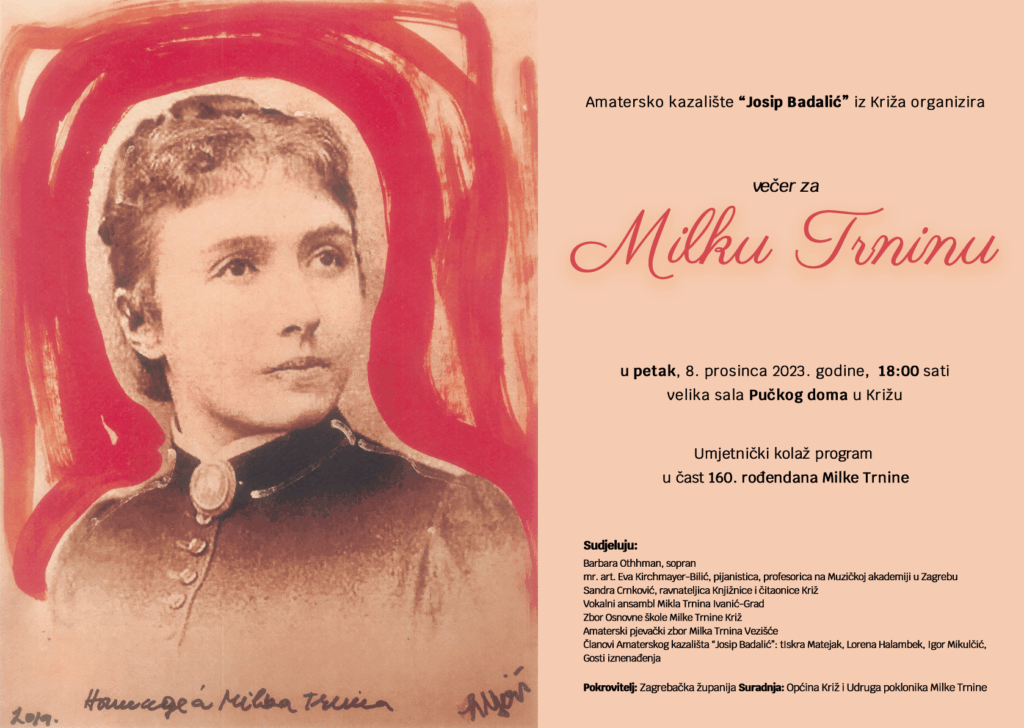 “Večer za Milku Trninu” u velikoj dvorani Društvenog doma u Križu. Riječ je o umjetničkom kolaž program u čast 160.rođendana Milke Trnine.