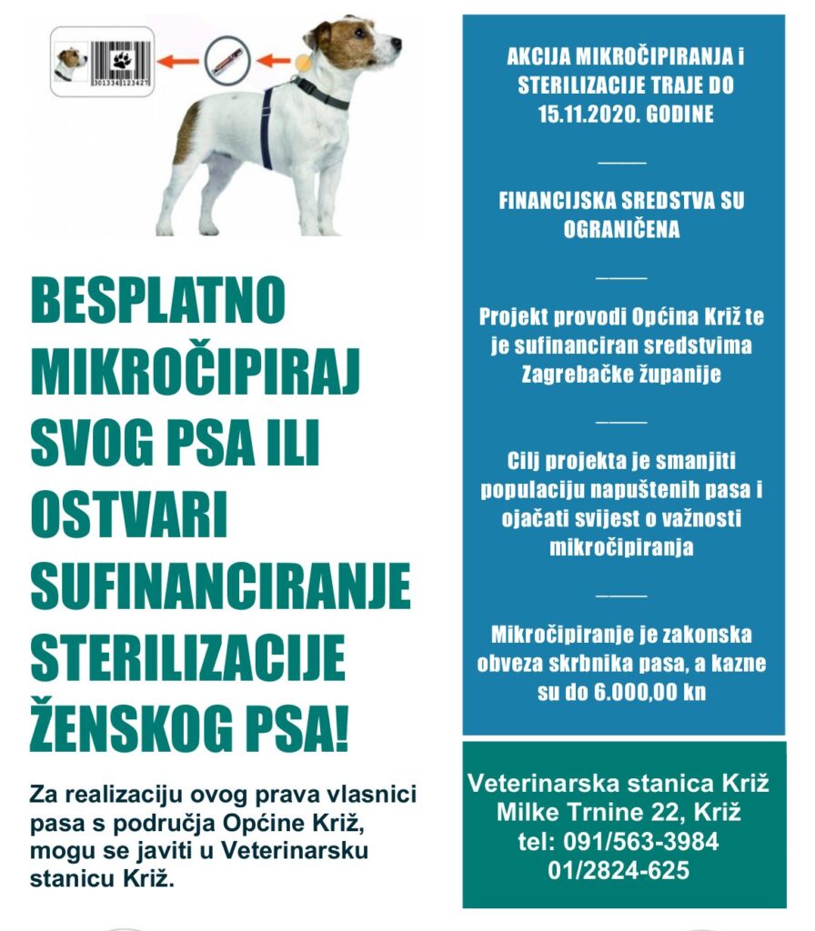 Iz Proračuna Općine Križ financirati će se troškovi označavanja – mikročipiranja pasa i sterilizacije ženskih pasa na području Općine Križ, a na temelju Ugovora o dodjeli sredstava sklopljenog između Općine Križ i Zagrebačke županije kojim je Zagrebačka županija Općini Križ dodijelila sredstva u iznosu 8.101,00 kn za financiranje programa kontrole populacije napuštenih pasa na području Zagrebačke županije – mjere označavanja pasa i sterilizacija kuja. Financiranje troškova mikročipiranja pasa, odnosno sufinanciranje troškova sterilizacije kuja na području Općine Križ će se realizirati preko Veterinarske stanice Križ d.o.o., Križ, Milke Trnine 22. Veterinarska stanica Križ će izvršiti uslugu za pse, čiji vlasnici imaju prebivalište na području Općine Križ. Vlasnici pasa s područja Općine Križ koji žele ostvariti neku od spomenutih usluga, mogu se javiti u Veterinarsku stanicu Križ.