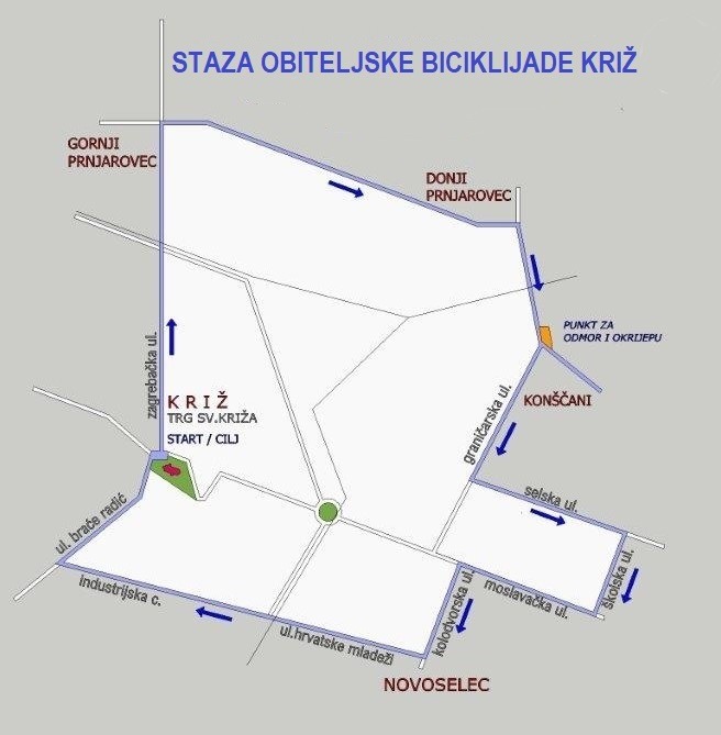 STAZA BICIKLIJADE: Start je na Trgu Sv. Križa, zatim se Zagrebačkom ulicom vozi u Gornji Prnjarovec, te Donji Prnjarovec iz kojeg se vozi u pravcu naselja Konšćani. Kod društvenog doma u Konšćanima predviđena je okrjepa. Iz Konšćana se vozi Graničarskom ulicom te se skreće u Selsku ulicu, a iz nje u Školsku ulicu u Novoselcu. Iz Školske ulice skreće se desno u Moslavačku ulicu, zatim u Kolodvorsku ulicu u Novoselcu iz koje se preko Ulice hrvatske mladeži vozi u smjeru Industrijske ceste sve do Ulice braće Radić po kojoj se vozi u smjeru Križa do cilja na Trgu Sv. Križa.