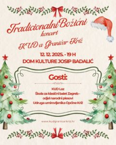 BOŽIĆNI KONCERT KUD-a GRANIČAR Home / Događanja- naslovna / BOŽIĆNI KONCERT KUD-a GRANIČAR BOŽIĆNI KONCERT KUD-a GRANIČAR – 12.12.2025. (petak)– 19 sati /Dom kulture Josip Badalić, Križ BOŽIĆNI KONCERT KUD-a GRANIČAR BOŽIĆNI KONCERT KUD-a GRANIČAR – 12.12.2025. (petak)– 19 sati /Dom kulture Josip Badalić, Križ Ispiši ovu objavu