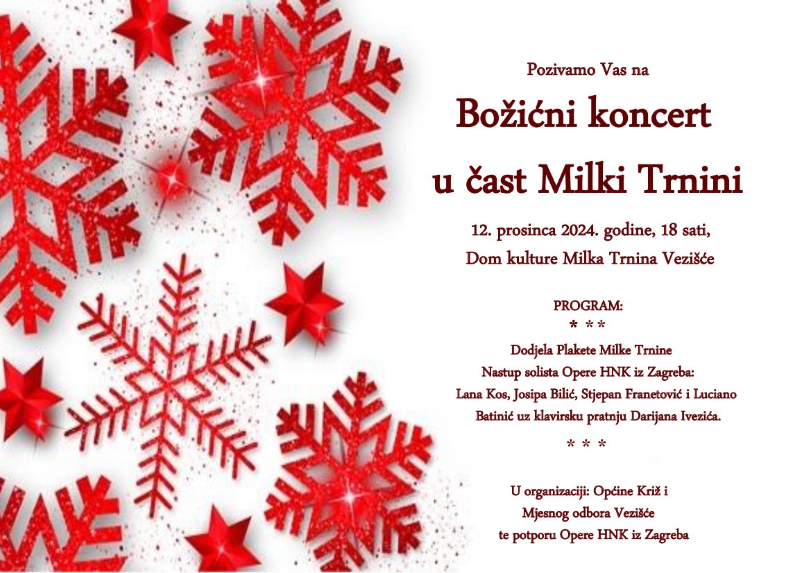 U organizaciji tradicionalnog božićnog koncerta i ove je godine Općina Križ uz potporu Mjesnog odbora Vezišće te već više desetljeća, neupitnu potporu i suradnju Opere HNK iz Zagreba čiji vrhunski operni umjetnici dolaze besplatno nastupati u rodno selo velike Milke Trnine.
