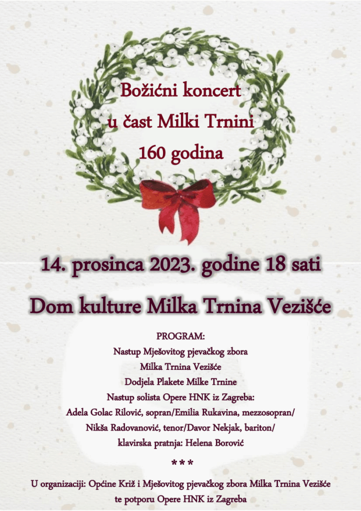 Općina Križ u suradnji s Operom HNK iz Zagreba, poziva sve na tradicionalni Božićni koncert u čast Milki Trnini i obilježavanje 160 godina rođenja slavne operne dive u četvrtak, 14. prosinca 2023. godine, u 18 sati, u Dom kulture Milka Trnina Vezišće.