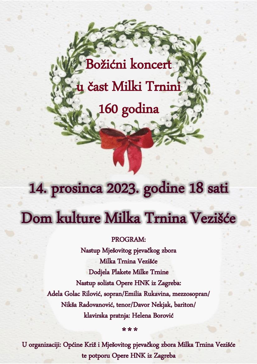 Općina Križ u suradnji s Operom HNK iz Zagreba, poziva sve na tradicionalni Božićni koncert u čast Milki Trnini i obilježavanje 160 godina rođenja slavne operne dive u četvrtak, 14. prosinca 2023. godine, u 18 sati, u Dom kulture Milka Trnina Vezišće.