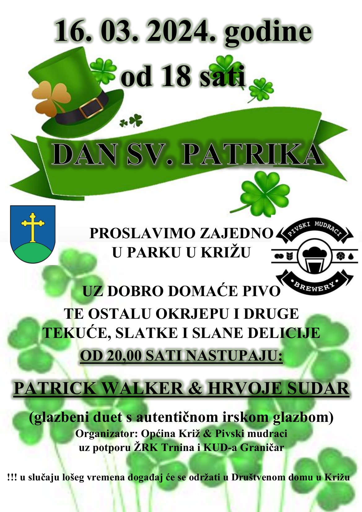 Budući da se Općina Križ već etablirala kao mjesto dobrog piva, zahvaljujući Pivskim mudracima, upravo u suradnji s tom malom obiteljskom pivovarom, po prvi put u Križu, u subotu 16. ožujka 2024. godine s početkom u 18, sati u parku u Križu (prodajni plato) obilježavamo Dan Svetog Patrika.