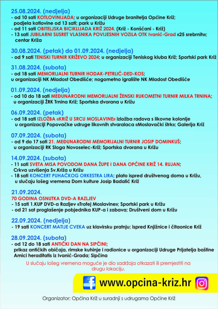 U nedjelju 25. kolovoza 2024. godine slijedi kotlovinijada Udruge branitelja Općine Križ i tradicionalna obiteljska biciklijada, a u 13 sati ponovno u Križ dolazi JUBILARNI SUSRET VLASNIKA POVIJESNIH VOZILA OTK Ivanić-Grad „25 srebrnih“.
