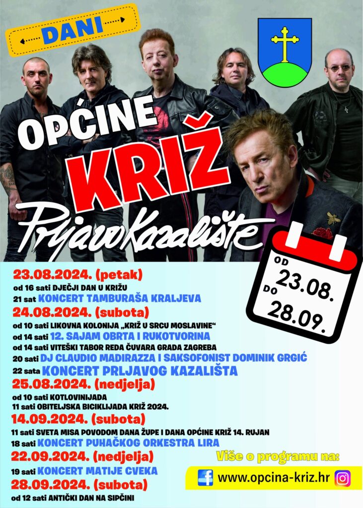 I ove godine Općina Križ u suradnji s brojnim udrugama s područja Općine pripremila je povodom Dana Općine Križ, mjesec dana programa u kojem svatko može naći nešto za sebe. Najzabavniji vikend u godini u Općini Križ bit će od 23. do 25. kolovoza 2024. godine, a začinit će ga KONCERT PRLJAVOG KAZALIŠTA.