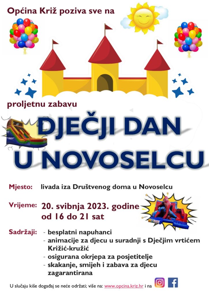 Općina Križ i ove godine za sve mališane organizira Dječji dan u Novoselcu. Ponovno smo pripremili 10 šarenih napuhanaca na kojima će djeca moći uživati od 16 do 21 sat u subotu 20. svibnja 2023. godine na livadi iza Društvenog doma u Novoselecu. Zabava je besplatna, a bit će i prigodno osvježenje za roditelje te slatko za djecu. Odgojiteljice Dječjeg vrtića Križić-kružić Križ za sve su mališane pripremile dodatne animacije i zabavne igre. Ukoliko bi padala kiša, događaj se neće moći održati, a eventualnim izmjenama u organizaciji biti će informacija na Internet stranice Općine Križ, Facebooku i Instagramu.