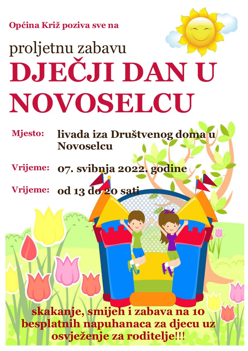 Općina Križ za sve mališane organizira Dječji dan u Novoselcu. Pripremili smo 10 šarenih napuhanaca na kojima će djeca moći uživati od 13 do 20 sati u subotu 7. svibnja 2022. godine na livadi iza Društvenog doma u Novoselecu. Zabava je besplatna, a bit će i prigodno osvježenje za roditelje. Ako vremenske prilike ne budu dobre, odnosno ukoliko bi padala kiša, događaj će se održati u nekom drugom terminu o čemu ćete biti informirani putem Internet stranice Općine Križ, Facebooka i Instagrama.