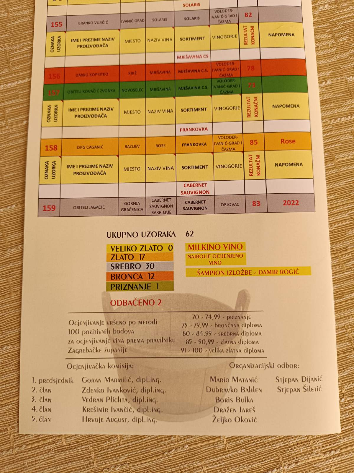 Ove godine počasni naziv Milkino vino osvojio je chardonnay obitelji Gorić iz Gornjeg Prnjarovca. Ukupno najbolje ocijenjeno vino je škrlet, Tihomira Tkalčića iz Caginca, a šampion izložbe je Damir Rogić iz Donjeg Prnjarovca.