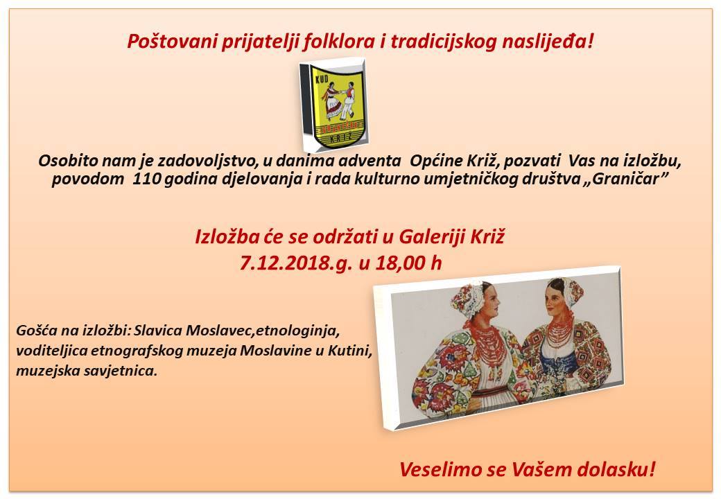 Kud Graničar Križ ove godine obilježava 110 godine djelovanja, nastavljajući tradiciju rada i djelovanja Hrvatskog pjevačkog društva Kumičić osnovanog 1908. godine. Tu veliku obljetnicu započinju slaviti u petak, 7.12.2018. godine u Galeriji Križ s početkom u 18 sati, izložbom posvećenom svima koji su u KUD-u provodili sate i dane na probama, nastupima, putovanjima  družili se kroz pjesme i plesove. Izložbom stoljetnih nošnji, folklornog ruva te izložbom slika generacija ludi, isplesanih koreograija i fundusa nošnji iz drugih krajeva lijepe naše, pokušati će dočarati lijepa sjećanja iz prošlosti u nadi za bolju budućnost KUD-a Graničar.