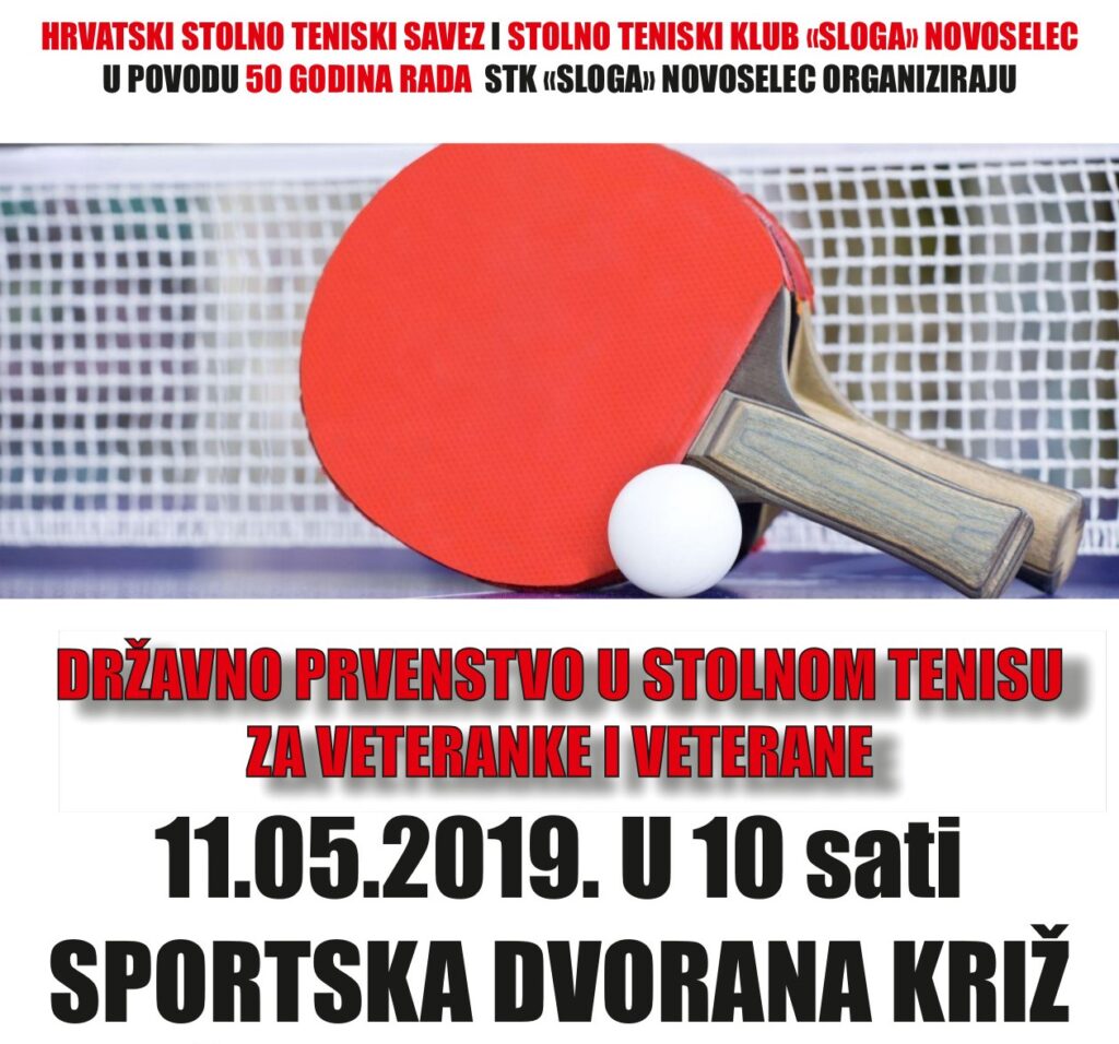U četvrtak, 9. svibnja 2019. godine u 19 sati, u Galeriji Križ održati će se izložba povodom obilježavanja 50 godina Stolnoteniskog kluba „Sloga“ Novoselec. Na izložbi će se moći vidjeti dokumentirani uspjesi kroz 50 godina vrijednog rada ovog kluba, a koji će u sklopu ove velike obljetnice, u subotu 11.05.2019. godine, biti domaćin Državnog veteranskog prvenstva u stolnom tenisu koje će se održati u školskoj sportskoj dvorani u Križu od 10 sati. Očekuje se oko stotinjak sudionika koji će se natjecati pojedinačno i u parovima.