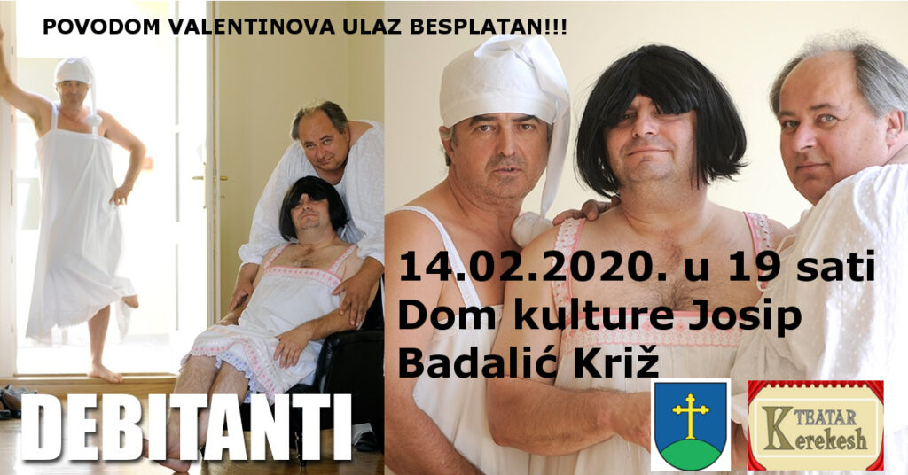 Općina Križ svojim mještanima povodom Dana zaljubljenih poklanja besplatnu predstavu “Debitanti” u režiji Kerekesh Teatra i to u petak 14.02.2020. godine u Domu kulture Josip Badalić u Križu s početkom u 19 sati.