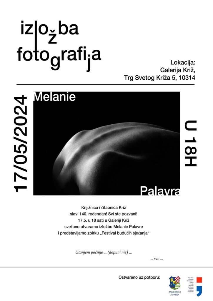 17. svibnja 2024. godine u 18 sati u Galeriji Križ održati će se svečano otvorenje izložbe fotografija Melanie Palavre i predstavljanje zbirke „Festival budućih sjećanja“ pete knjige