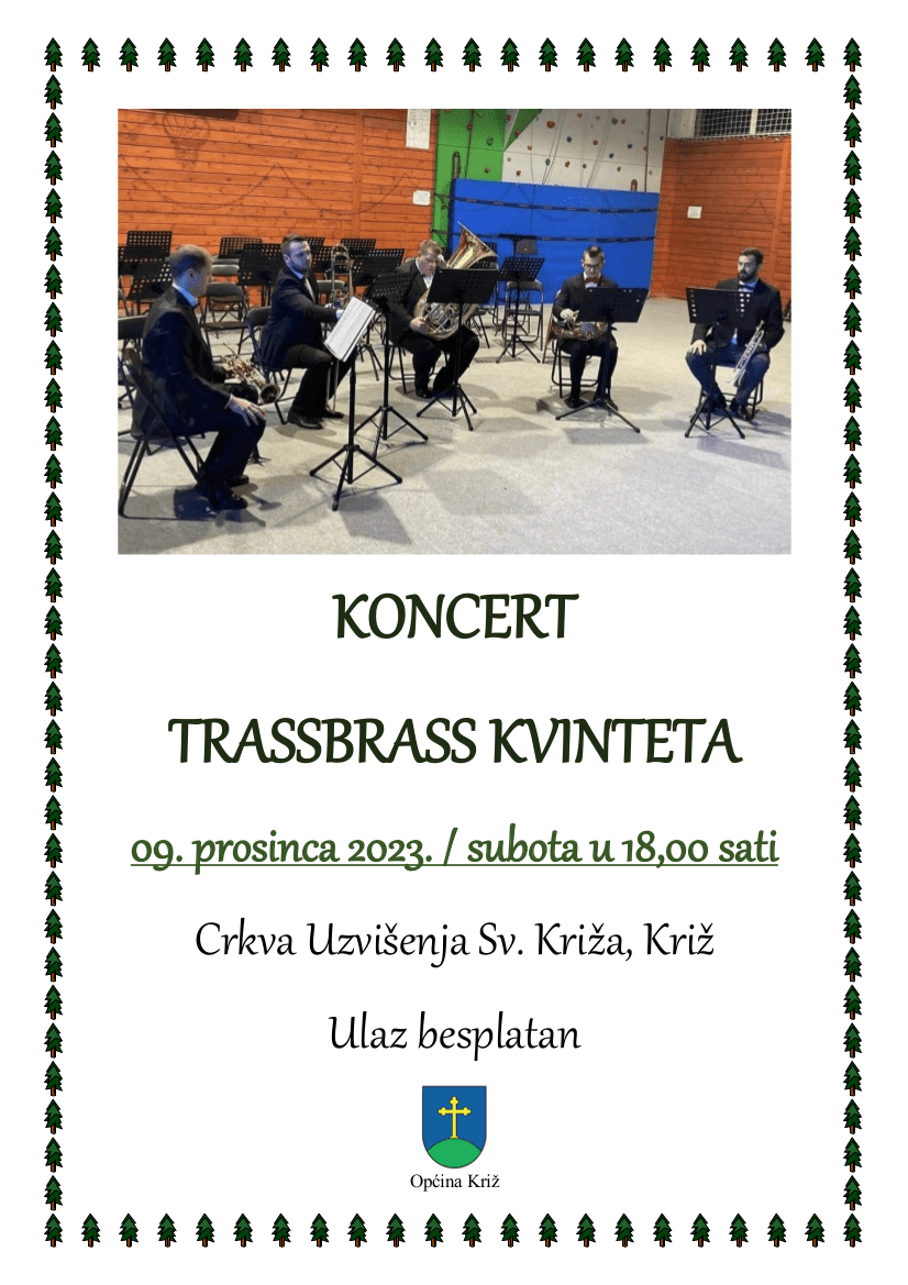 Iduće subote 09. prosinca 2023. godine za sve ljubitelje puhačkih instrumenata pripremamo pravu poslasticu. Mihael Križančić, glazbenik i član Hrvatske udruge orkestralnih i komornih umjetnika te voditelj Limene glazbe DVD-a Križ, sa svojim će kvintetom u Župnoj crkvi Uzvišenja Sv. Križa u Križu izvesti prigodni božićni repertoar. Koncert je besplatan i započinje u 18 sati.
