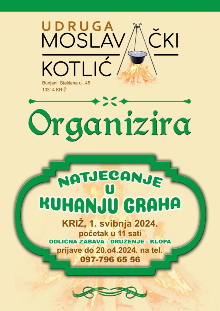 Najmlađa udruga Općine Križ, Udruga moslavački kotlić predstavit će svoj rad i viziju natjecanjem u spravljanju graha koje će se održati na praznik rada 01. svibnja 2024. godine s početkom u 11 sati u parku u Križu. Na natjecanje je prijavljeno čak 22 ekipe, a organizatori pozivaju sve na besplatno kušanje graha i obećaju druženje i dobru zabavu.