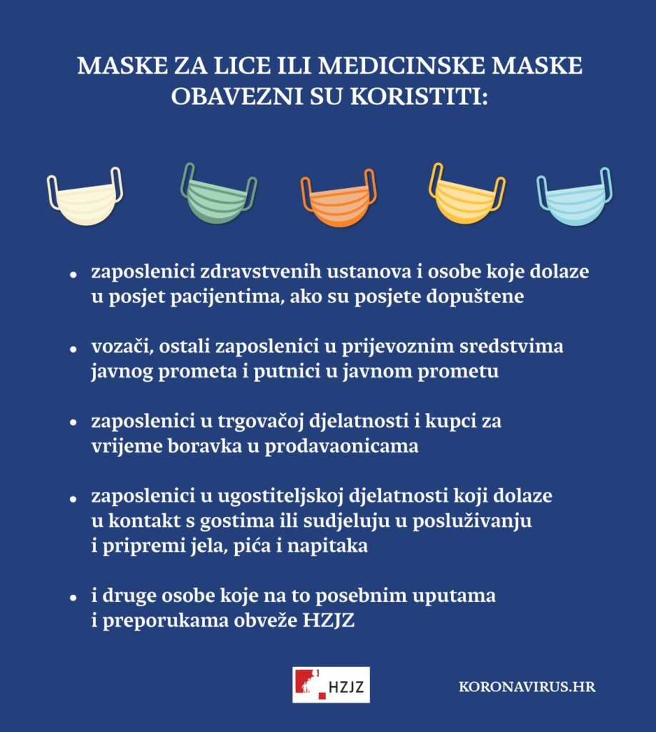 Nacionalni stožer civilne zaštite Republike Hrvatske donio je 10. srpnja 2020. godine dvije nove odluke koje se primjenjuju od danas, 13. srpnja 2020. godine. Naime vezano uz pogoršano stanje pandemije uzrokovane virusom COVID-19 i sve veći broj zaraženih osoba, uvodi se obvezno korištenje maski za lice za zaposlenike zdravstvenih ustanova i osobe koje dolaze u posjet pacijentima, za ugostitelje te u prodavaonicama i u javnom prometu. Također daju se nove preporuke i strože mjere vezano uz sva okupljanja na kojima je prisutno više od sto sudionika.