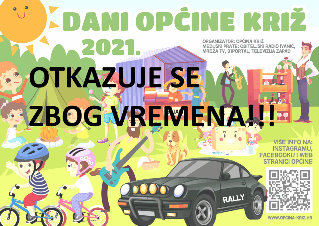 Zbog najave nepovoljnih vremenskih prilika i obilnih padalina, otkazuje se sutrašnji program obilježavanja Dana Općine Križ. Čekali smo do posljednjeg trena u nadi da će se najavljena vremenska prognoza ipak promijeniti. Općina Križ donijela je odluku o otkazivanju manifestacija koje su planirane za dan 28. kolovoza 2021. godine.