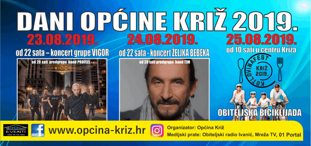 U subotu 24. kolovoza od 15 sati u parku u Križu tradicionalno se održava Sajam obrta i rukotvorina s preko 20 izlagača. Za najmlađe će također biti mnogo zabavnog za što će se pobrinuti Tvornica smijeha iz Ivanić-Grada koja će pripremiti mađioničara, zanimljive radionice te maskote i besplatni face painting. Vatrogasna zajednica mališanima će omogućiti da isprobaju kako je to biti vatrogasac. Udruga vinogradara i vinara Škaf pripremila je štand s okrjepom, a pridružit će im se i KUD Graničar i njihovi tamburaši te Limena glazba Općine Križ. U večernjim satima očekuje nas koncert Željka Bebeka.