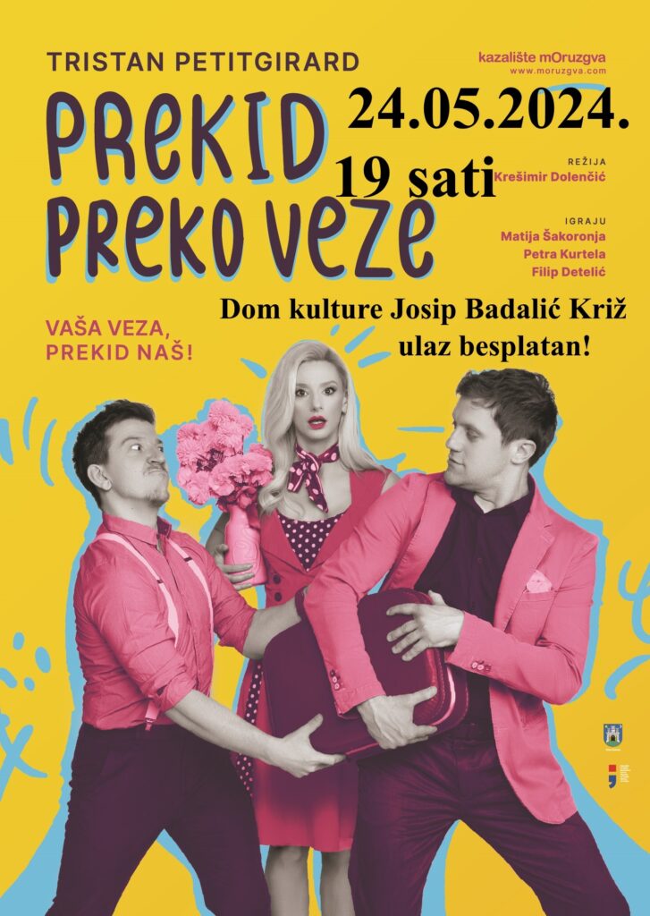 U sklopu obilježavanja 140. godina Knjižnice i čitaonice Križ, Općina Križ u suradnji s Knjižnicom nastavlja organizaciju kulturnih manifestacija za građane kojih tijekom svibnja i lipnja neće nedostajati. Donosimo vam 24. svibnja 2024. godine u petak, u Domu kulture Josip Badalić u Križu s početkom u 19 sati, još jednu u nizu besplatnih predstava, hit komediju Kazališta Moruzgva pod nazivom Prekid preko veze. Režiju predstave potpisuje Krešimir Dolenčić, a za odličnu izvedbu zaduženi su Petra Kurtela, Matija Šakoronja i Filip Detelić.