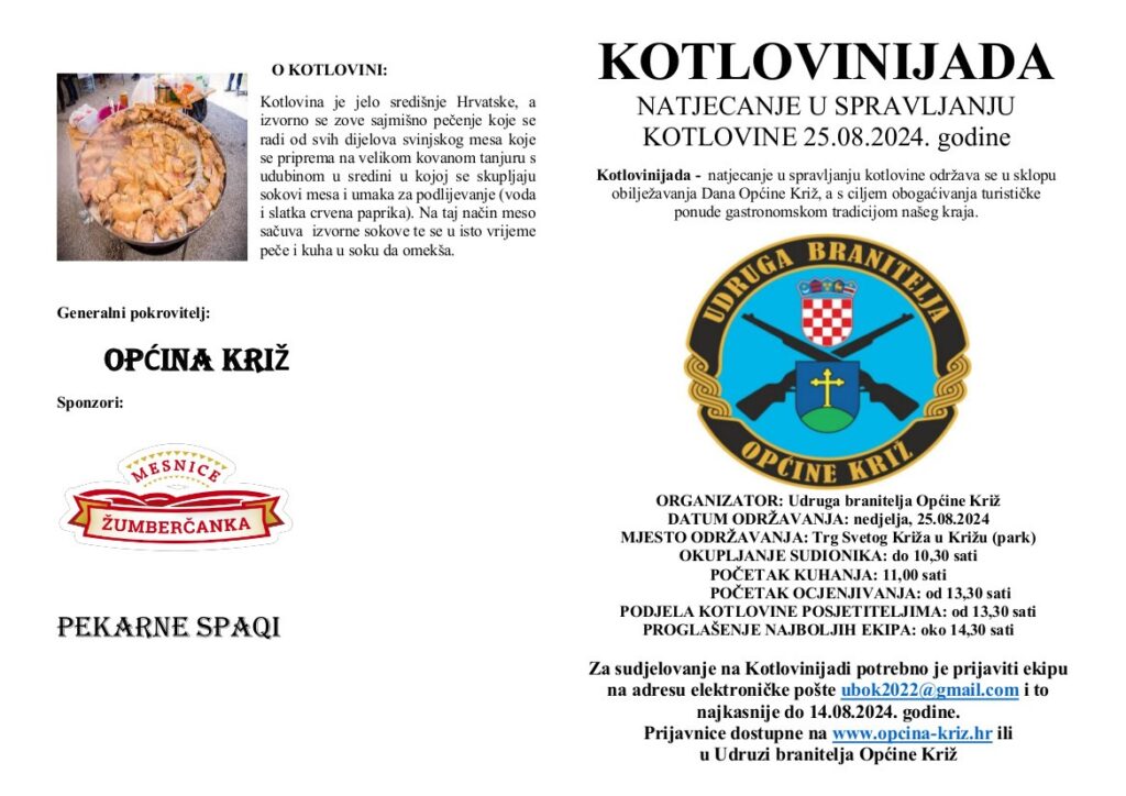 Natjecanje u spravljanju kotlovine, KOTLOVINIJADA Udruge branitelja Općine Križ i ove se godine, po drugi put u organizaciji spomenute udruge, održava u sklopu obilježavanja Dana Općine Križ, a s ciljem obogaćivanja turističke ponude gastronomskom tradicijom našeg kraja.