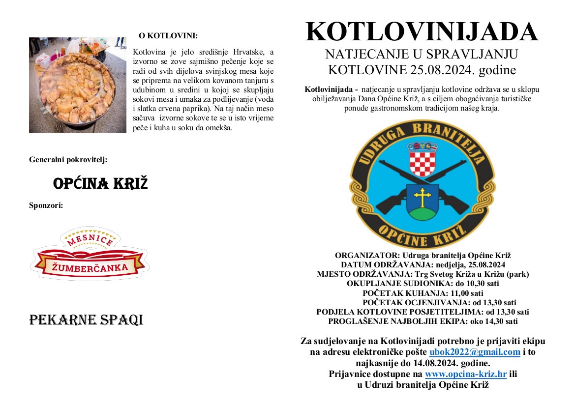 Natjecanje u spravljanju kotlovine, KOTLOVINIJADA Udruge branitelja Općine Križ i ove se godine, po drugi put u organizaciji spomenute udruge, održava u sklopu obilježavanja Dana Općine Križ, a s ciljem obogaćivanja turističke ponude gastronomskom tradicijom našeg kraja.