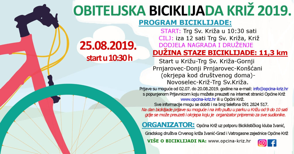 PRIJAVE: od 01.07. do 20.08.2019. godine na e-mail info@opcina-kriz.hr (prijavnice dostupne na www.opcina-kriz.hr), a sve informacije mogu se dobiti i na broj telefona 091 2824 517. Na dan biciklijade prijave i na info pultu u parku u Križu od 9 do 10 sati uz preuzimanje okrjepe za sve natjecatelje.