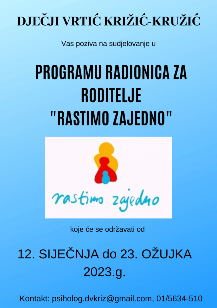 Imate li kakvih dvojbi i želja, pozivamo Vas da nam se pridružite na radionicama „Rastimo zajedno“ u kojima ćemo učiti i rasti zajedno s našom djecom.