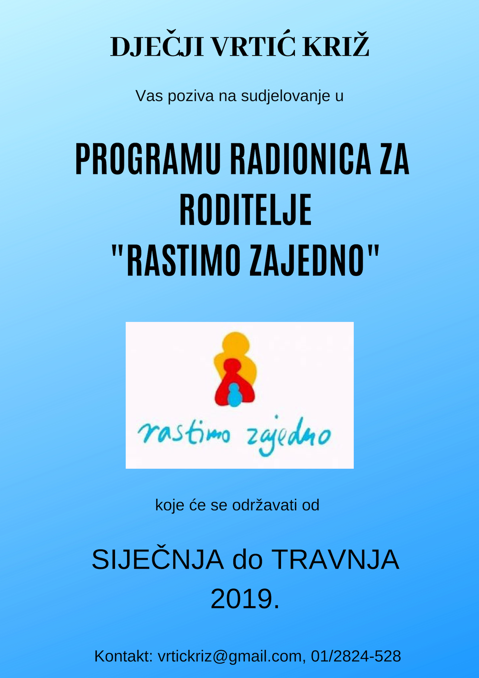 Imate li kakvih dvojbi i želja pozivamo Vas da nam se pridružite na radionicama „Rastimo zajedno“ u kojima ćemo učiti i rasti zajedno s našom djecom.