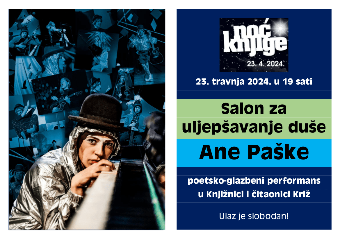U sklopu obilježavanja Noći hrvatske knjige 23. travnja 2024. u 19 sati u Knjižnici i čitaonici Križ možete pogledati poetsko-glazbeni performans pod nazivom „Salon za uljepšavanje duše“. Riječ je o svojevrsnom autorskom muzičkom performancu dramaturginje, glazbenice i izvođačice Ane Paške. Ulaz je slobodan!