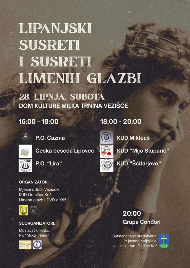 Limena glazba DVD-a Križ i Mjesni Odbor Vezišće u suradnji s Općinom Križ i KUD-om Graničar, poziva sve na poseban spoj dviju manifestacija, Susreta limenih glazbi i Lipanjski susreti – koje će se ove godine održati zajedno u srcu Vezišća i to 28. lipnja 2025. godine!