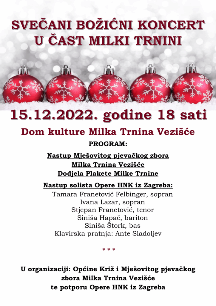Rodno selo operne dive Milke Trnine, nakon pandemijske pauze, ovog će prosinca ponovno biti domaćin glazbenim umjetnicima Opere Hrvatskog narodnog kazališta u Zagrebu koji će nastupiti na Svečanom božićnom koncertu u povodu obilježavanja rođendana Milke Trnine. Tom prigodom Općina Križ dodijelit će i Plaketu Milke Trnine. Na koncertu koji će se održati u četvrtak 15. prosinca u Domu kulture Milka Trnina Vezišće od 18,00 sati nastupaju Mješoviti pjevački zbora Milka Trnina Vezišće, a nakon toga solisti Opere HNK iz Zagreba i to: