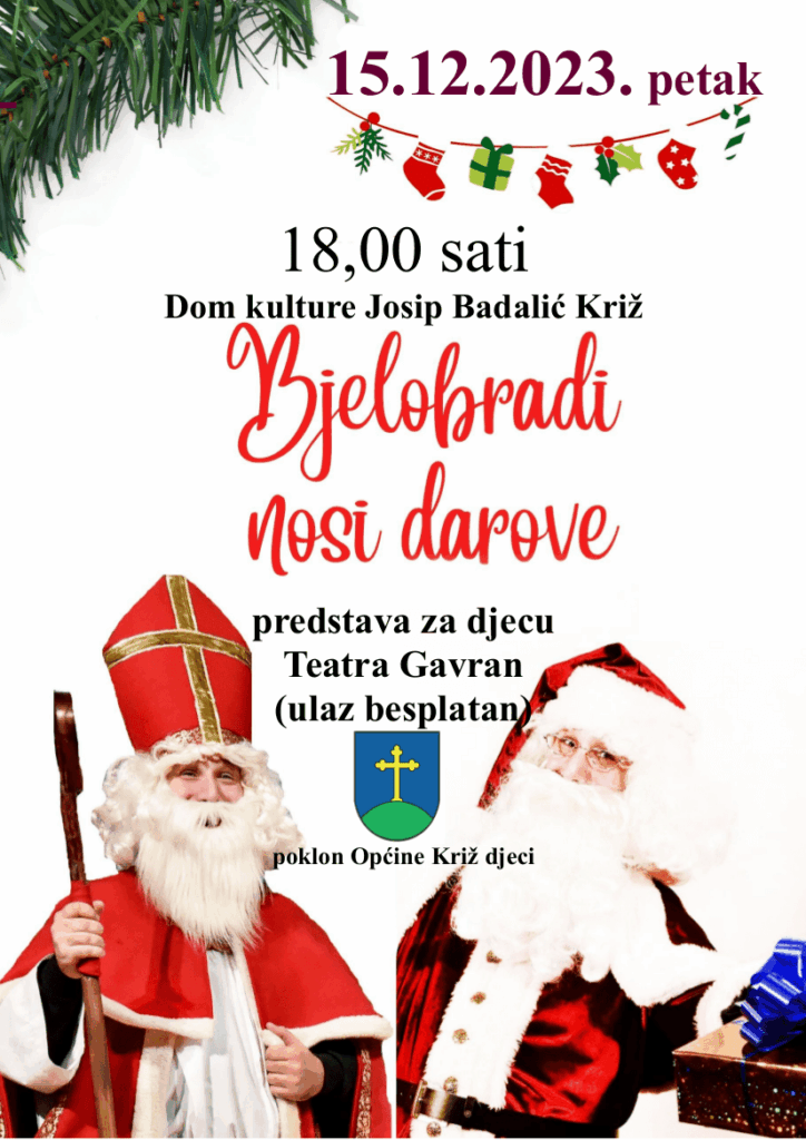 Vrijeme blagdana namijenjeno je darivanju, a Općina Križ djeci poklanja dječju predstavu Teatra Gavran „BJELOBRADI NOSI DAROVE“ i to u petak 15. prosinca u Domu kulture Josip Badalić s početkom u 18 sati. Bjelobradi i njegova pomoćnica djecu potiču na ljubav i dobrotu, a na tom putu susreću tri dječaka od kojih svako ima svoju životnu priču, a sukladno tome i ponašanje. Na kraju predstave Bjelobradi će se slikati s djecom!