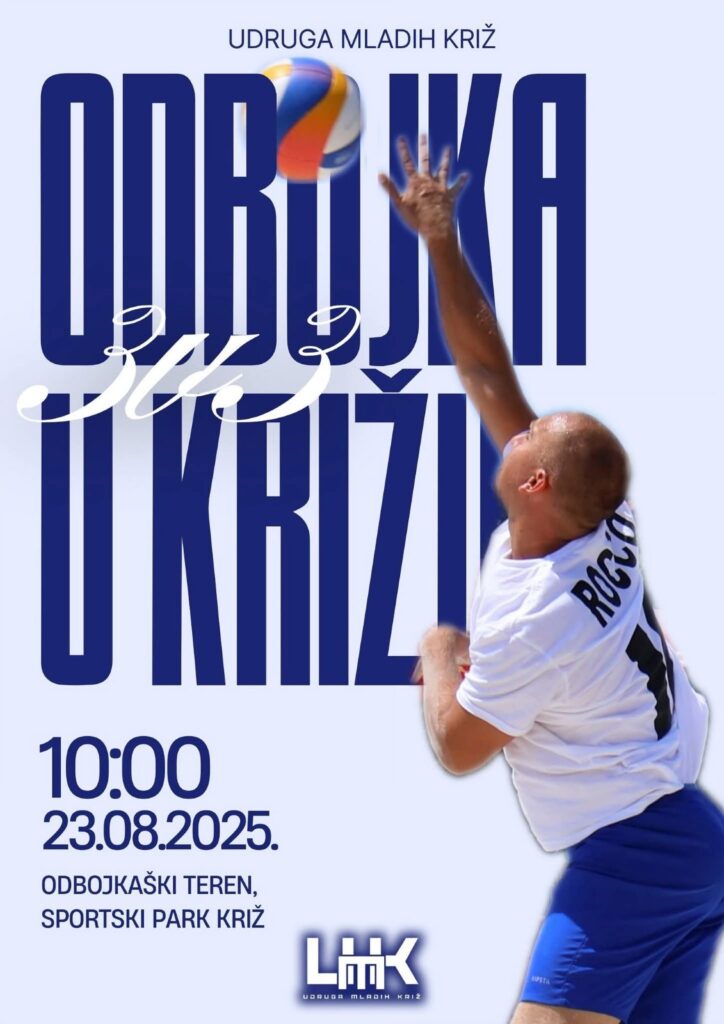 U subotu 23. kolovoza 2025. godine, vrijedna Udruga mladih Općine Križ, na Sportskom parku u Križu organizira 2. TURNIR U ODBOJCI NA PIJESKU i to od 10 sati.