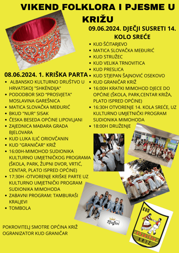 U subotu i nedjelu, 08. i 09. lipnja 2024. godine, Općina Križ ugostit će mnogobrojne velike i male folklorne skupine na smotrama folklora u organizaciji Kulturno umjetničkog društva Graničar iz Kri