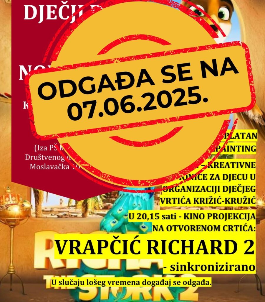 Planirano događanje Dječji dan u Novoselcu, prvenstveno zbog proglašenog Dana žalosti, a ujedno i najave ružnog vremena, kiše, odgađa se za subotu, 07. lipnja 2025. godine.