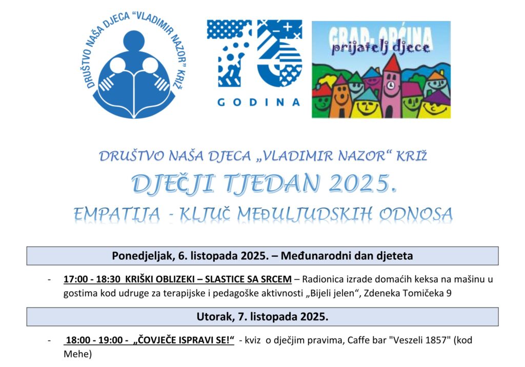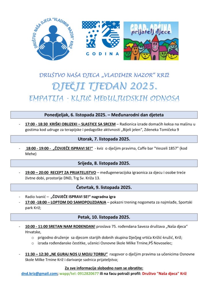 Upravo to, svojim planiranim aktivnostima tijekom idućeg tjedna provoditi će Društvo „Naša djeca“ Vladimir Nazor, Križ. Ovogodišnji moto Dječjeg tjedna je Ljubav djeci prije svega!. Dodatno, općinsko društvo u ovom dječjem tjednu kazuje na inkluzivnost, empatiju, znanje i vještine naših najmlađih, te primjerenim programima naglašava počasni status Općine prijatelja djece koju nosi Općina Križ.